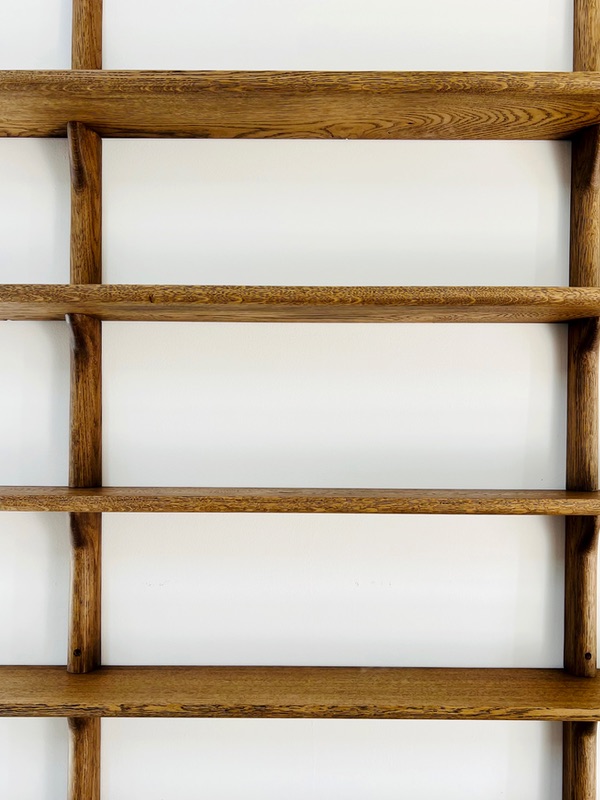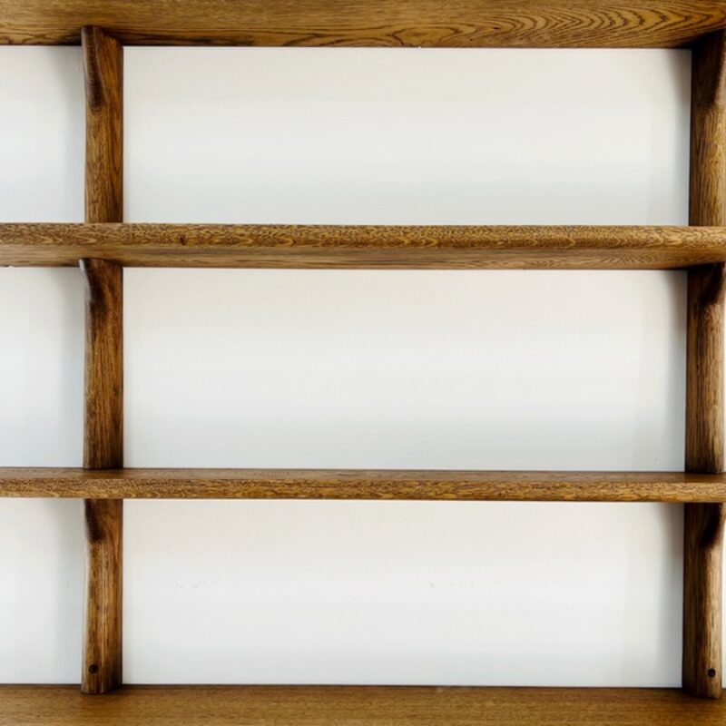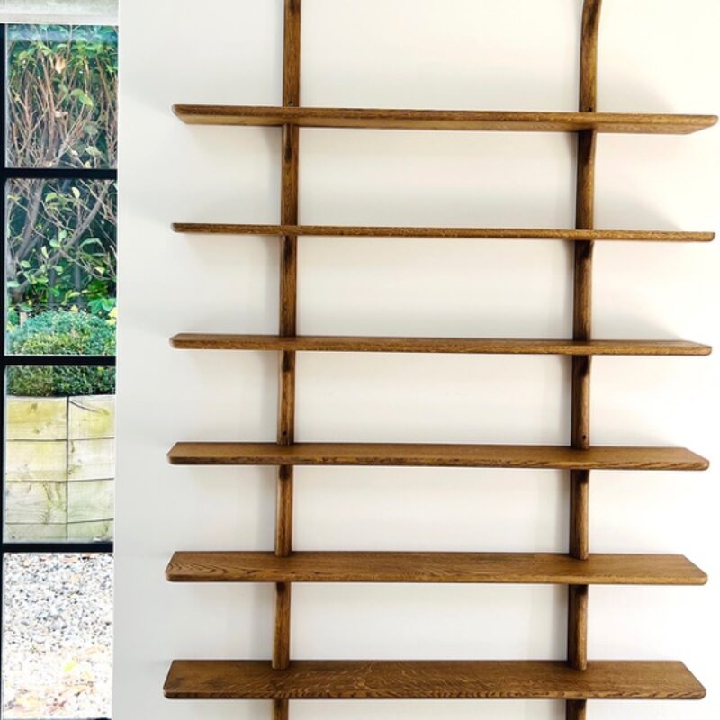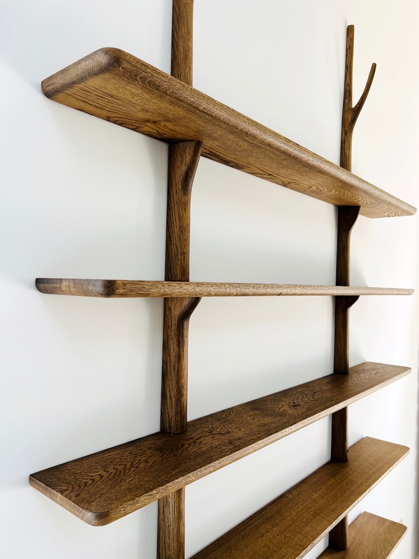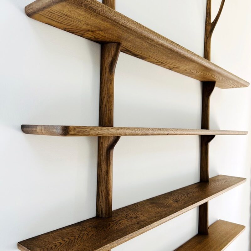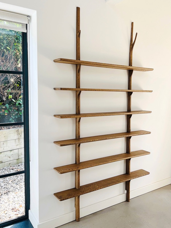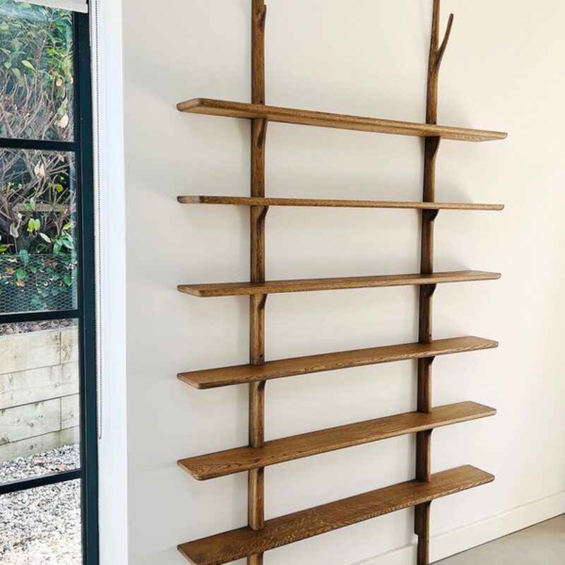 These simple, natural oak shelves are supported by solid oak uprights sculpted to look like tree branches giving an organic, soft appearance for interior storage.